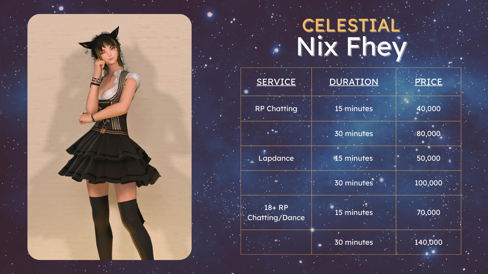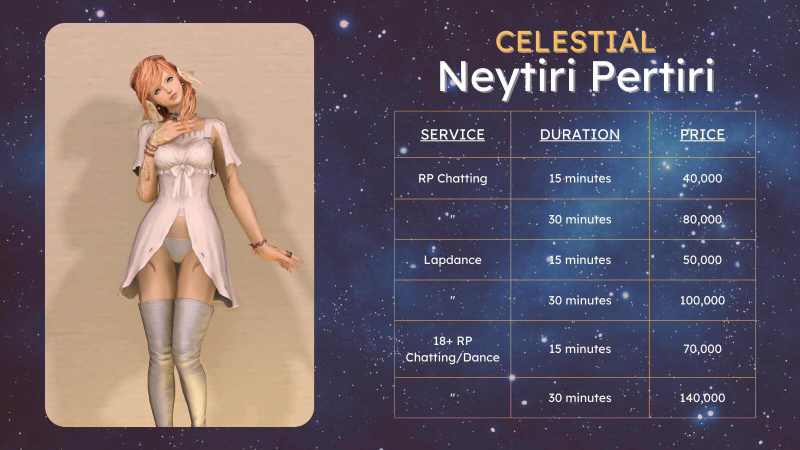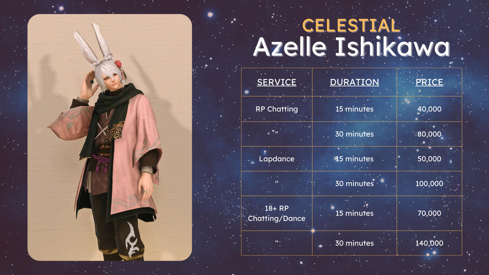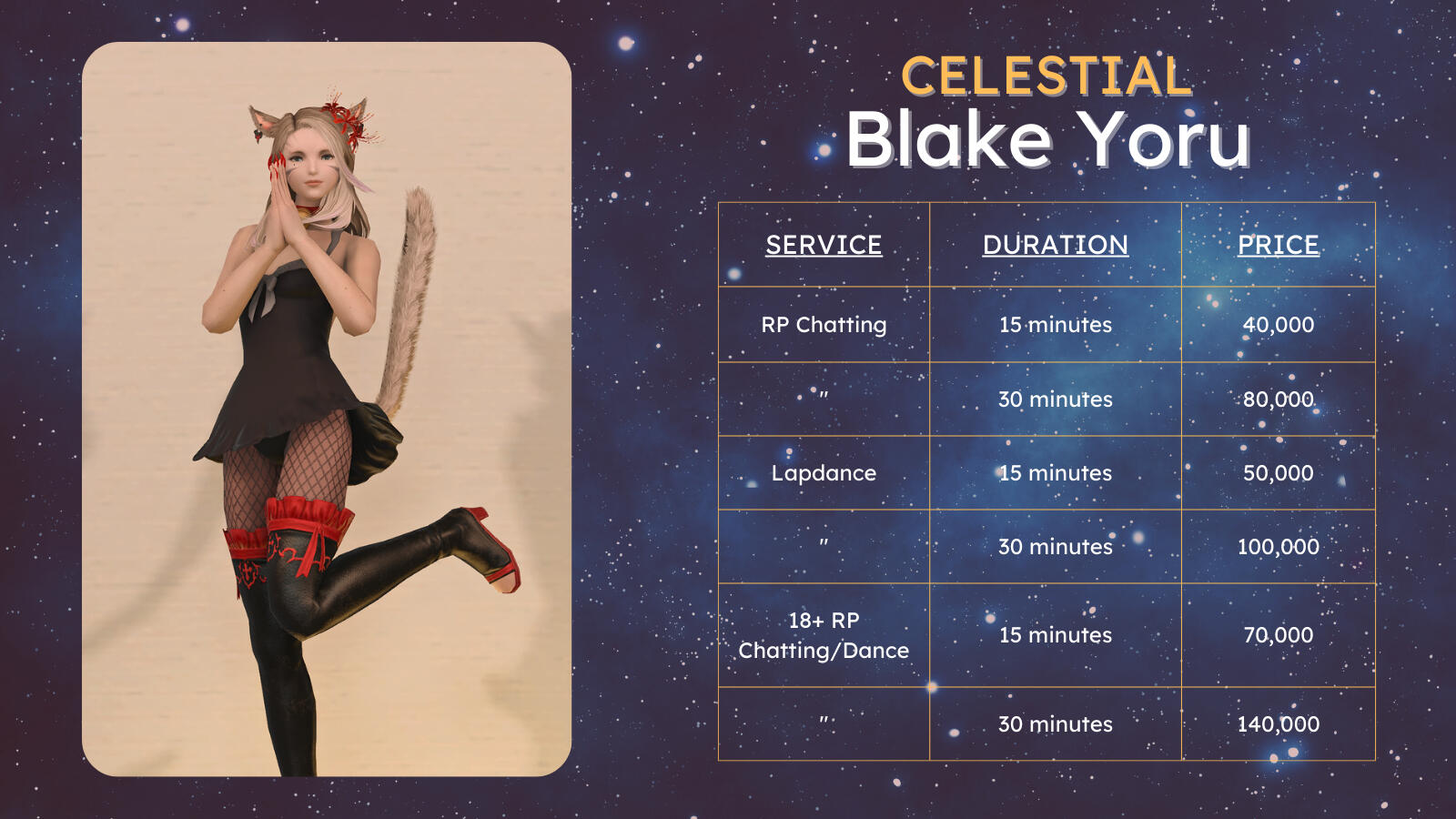 Please message Yuuzu Yuuki or Cath Palug to book a Celestial.