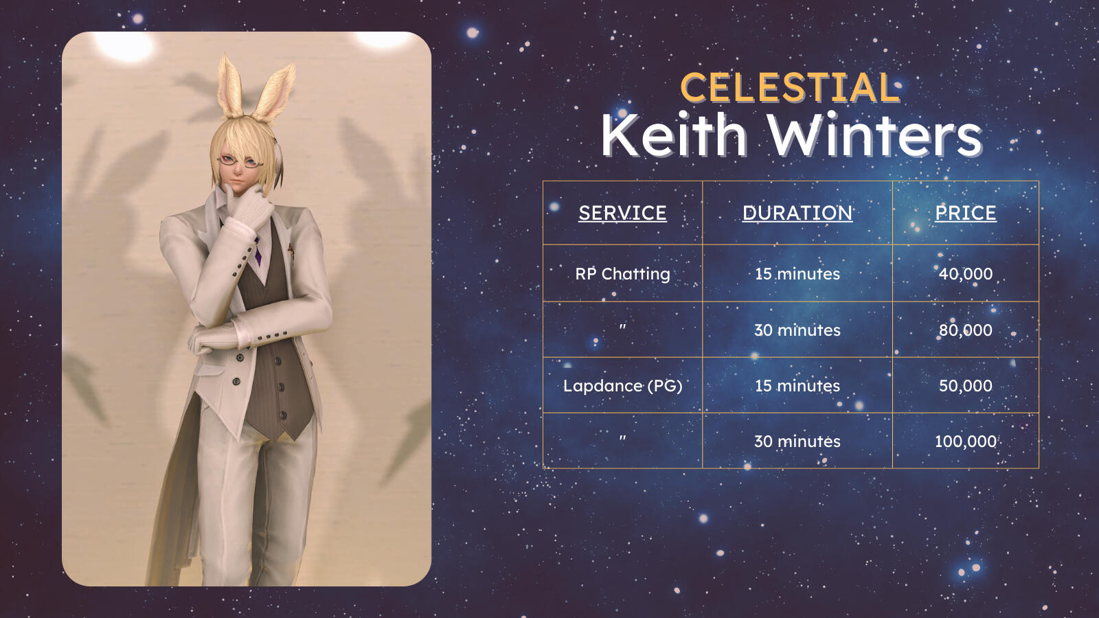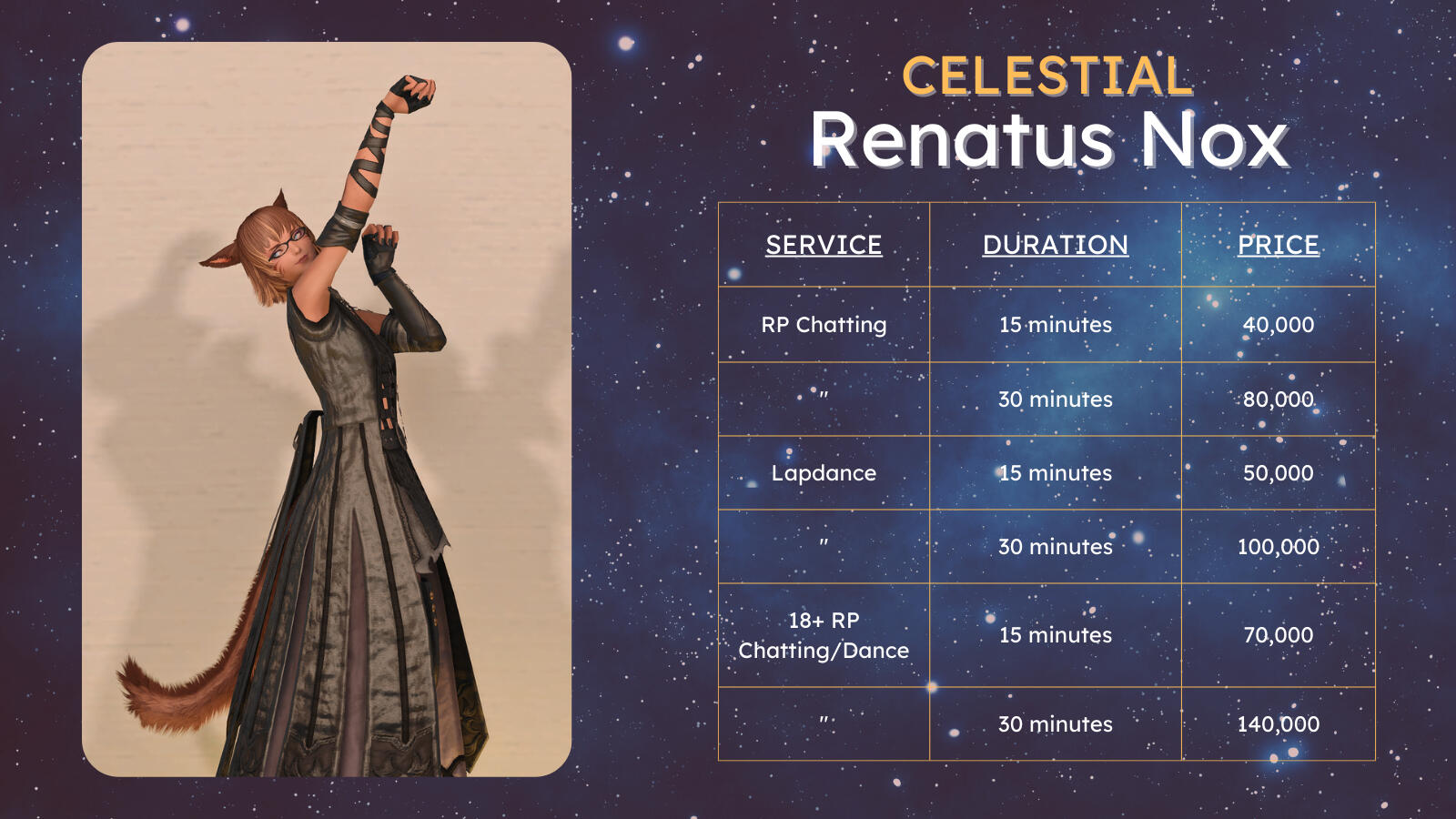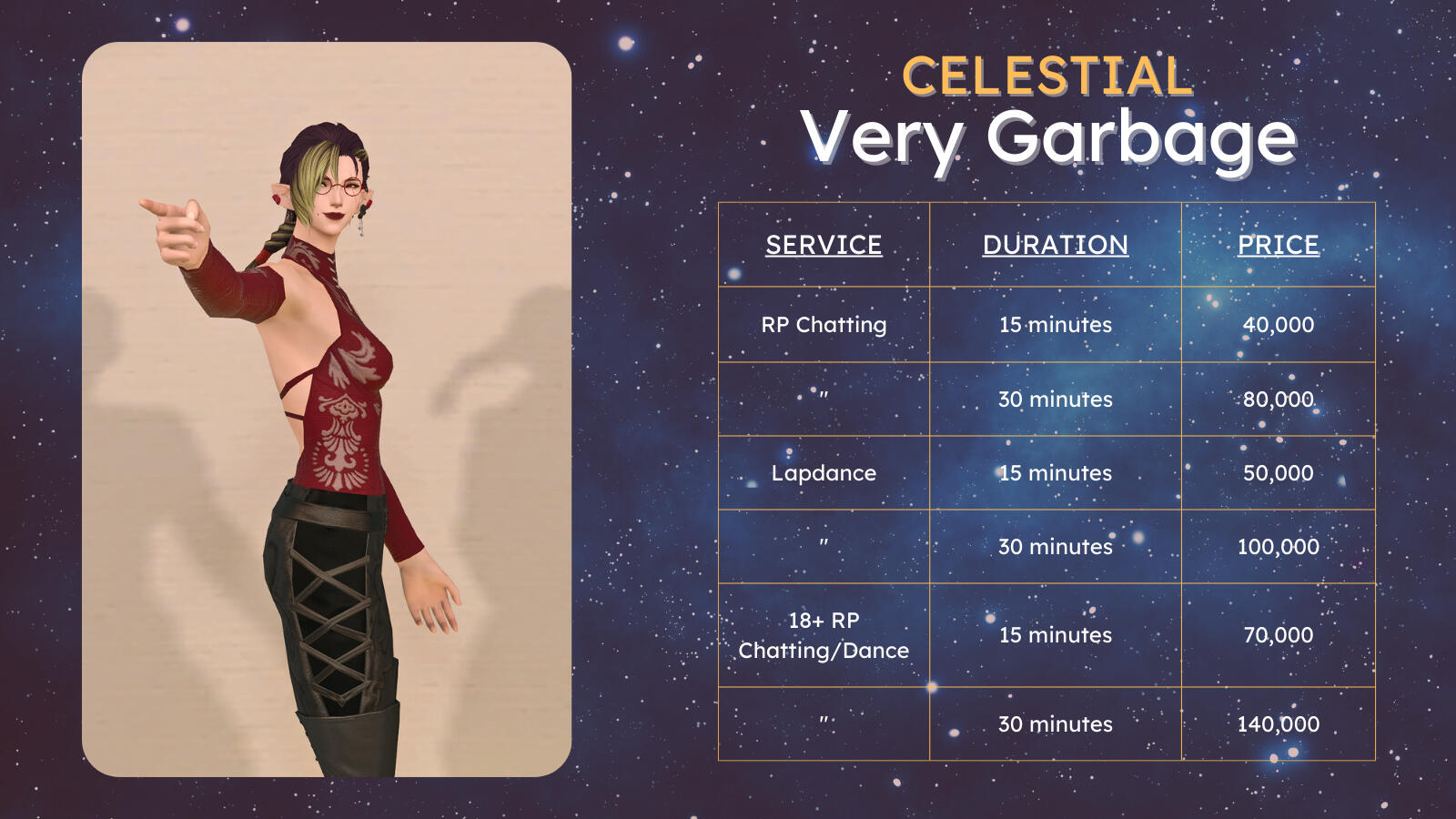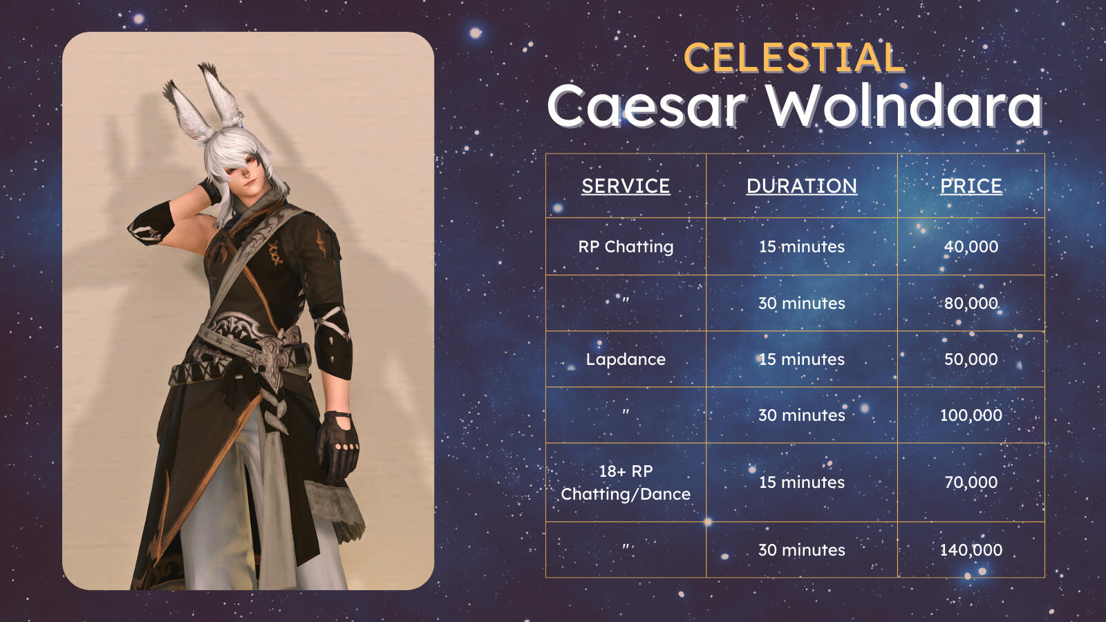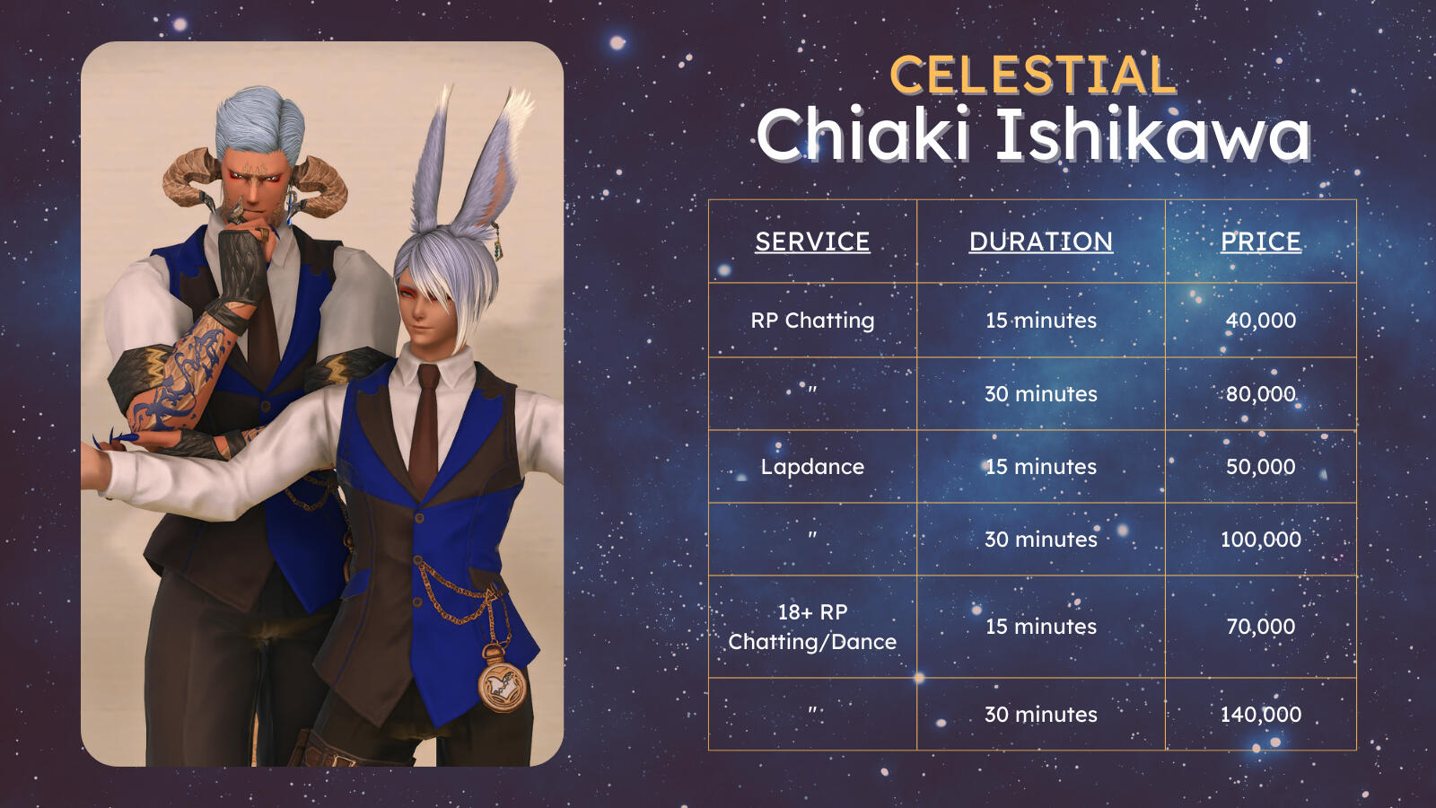 Please message Yuuzu Yuuki or Cath Palug to book a Celestial.